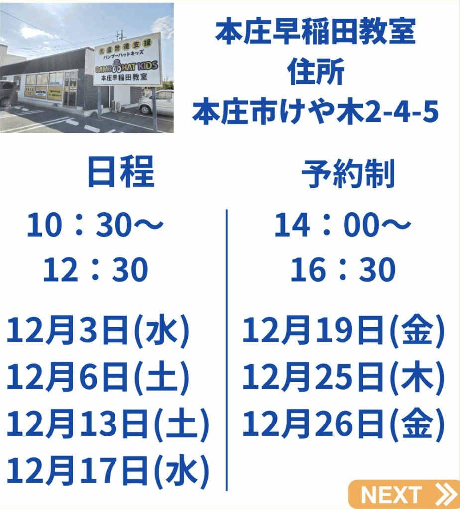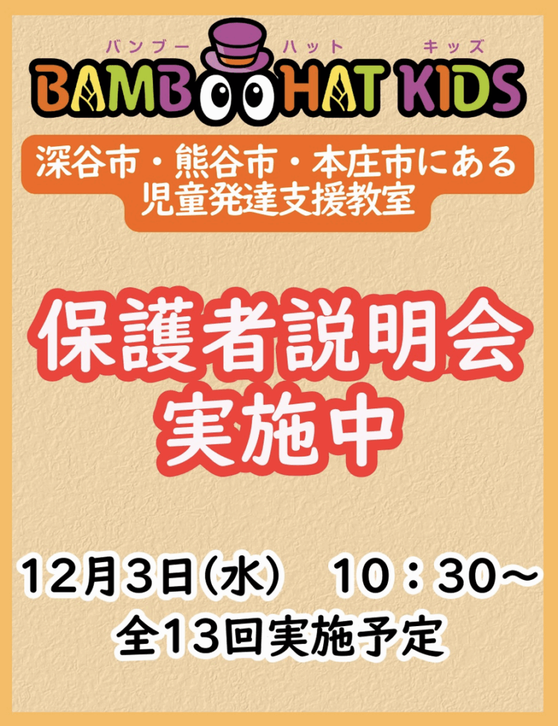 深谷市・熊谷市・本庄市にある児童発達支援教室「バンブーハットキッズ」が2025年最後の参加費無料の『保護者説明会(予約制)』を開催します😸
