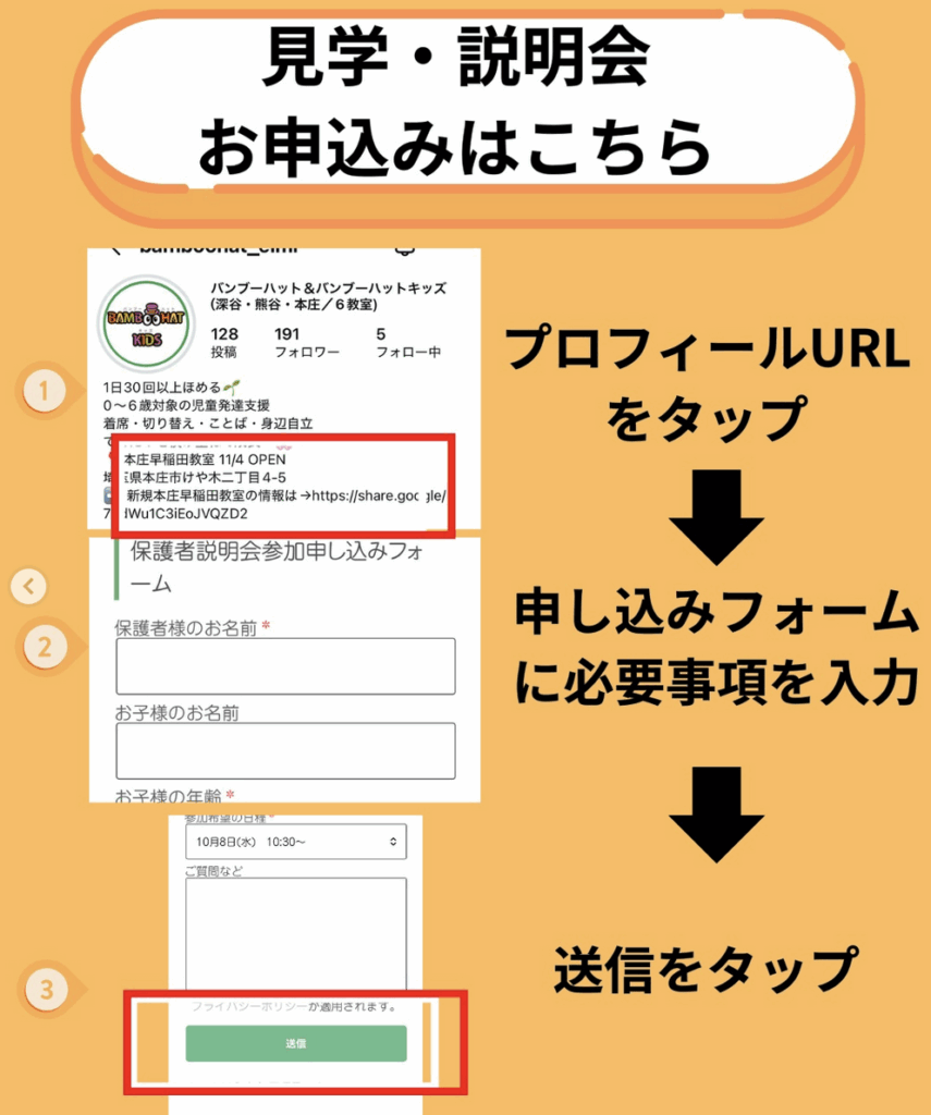 「バンブーハットキッズ本庄早稲田教室」や「有限会社エイミ」が運営する児童発達支援教室について気になった方は、まずはお気軽にご連絡ください📲