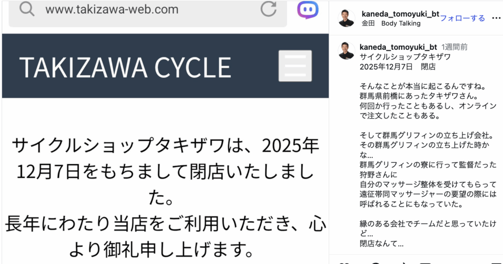 前橋市国領町にあったスポーツ用自転車専門店「サイクルショップタキザワ」が閉店したみたいです。