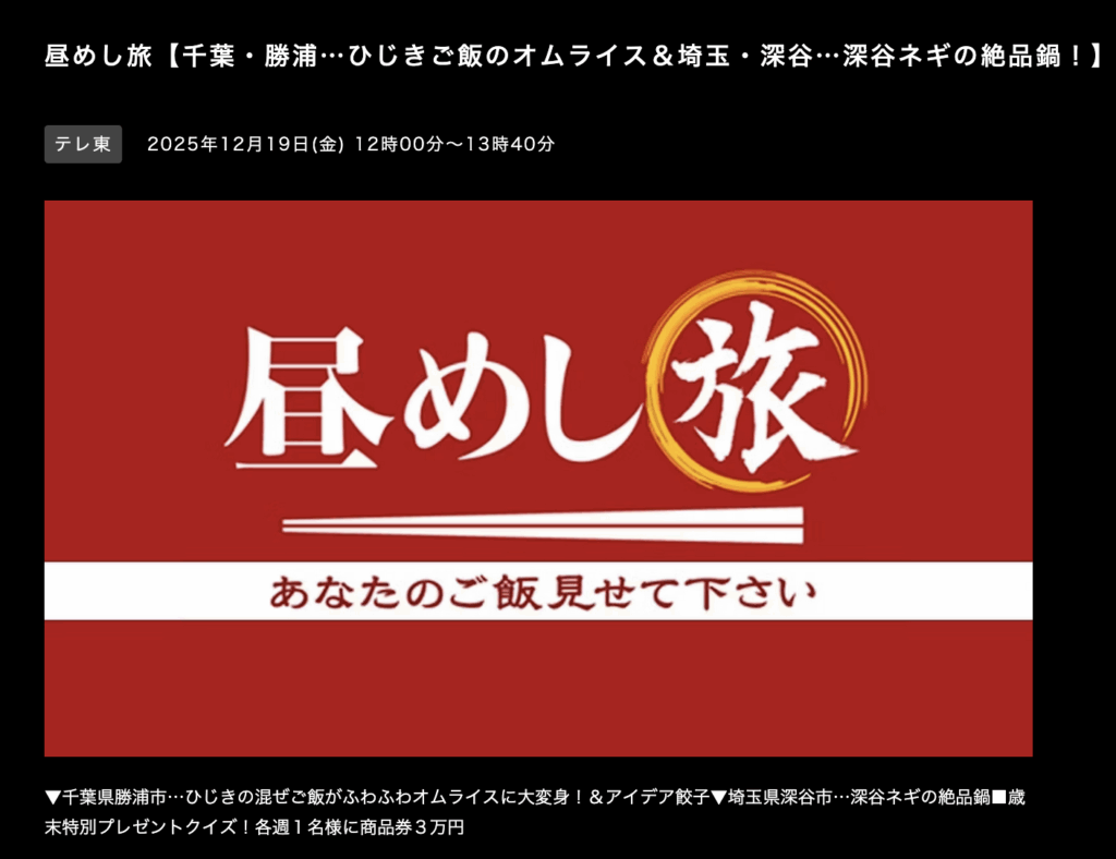 2025年12月19日(金)12:00~テレビ東京『昼めし旅 〜あなたのご飯見せてください〜』で深谷市が映るみたいです。