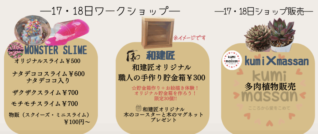 多肉植物やハンドメイド作品、体験型ワークショップなど、お子様から大人まで楽しめるブースが出店します。