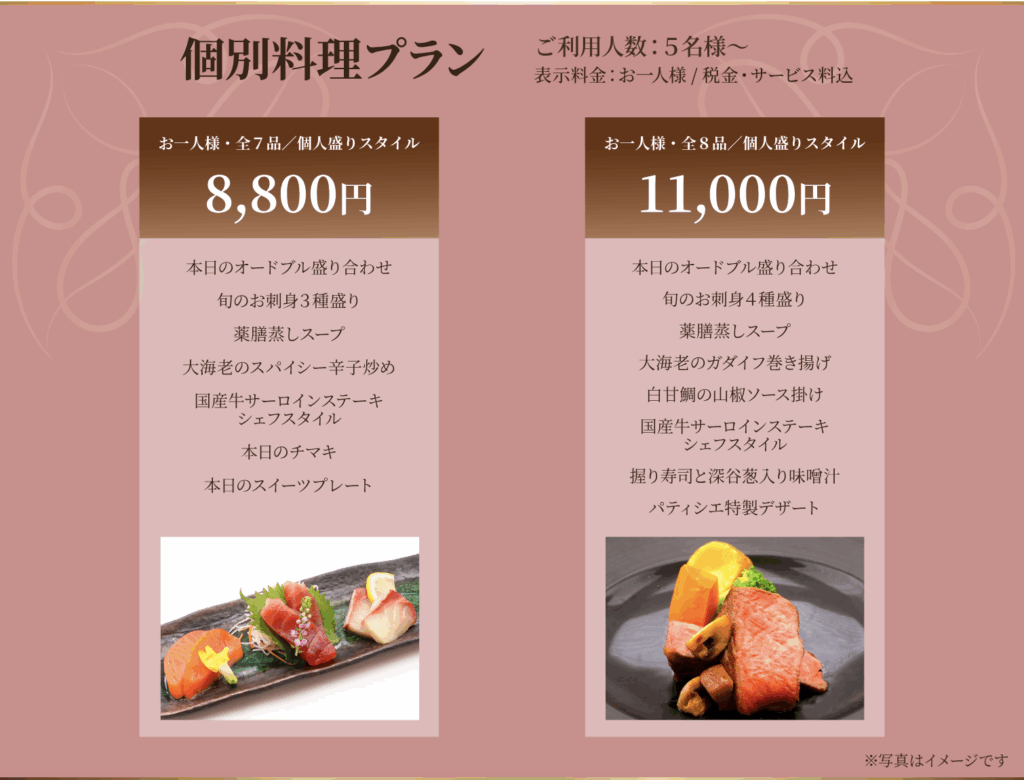 旬の食材を使用したメニューを中心に、幅広い年代の皆さまにお楽しみいただける内容となっており、幅広い年代の皆さまにお楽しみいただける内容&歓送迎会に最適なパーティープランとなっております💡
