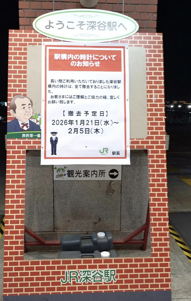 2026年1月21日(水)〜2月5日(木)にかけて深谷駅構内の時計が全て撤去されるそうです。