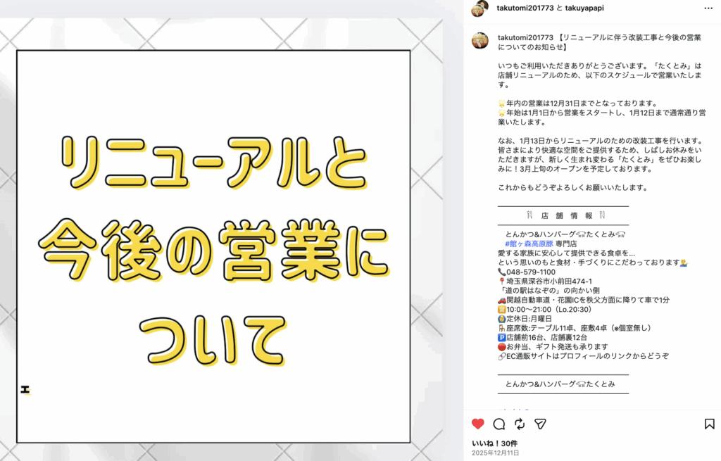 深谷市小前田にある「とんかつ&ハンバーグ たくとみ」がリニューアルに伴う改装工事のためしばらく休業するみたいです。