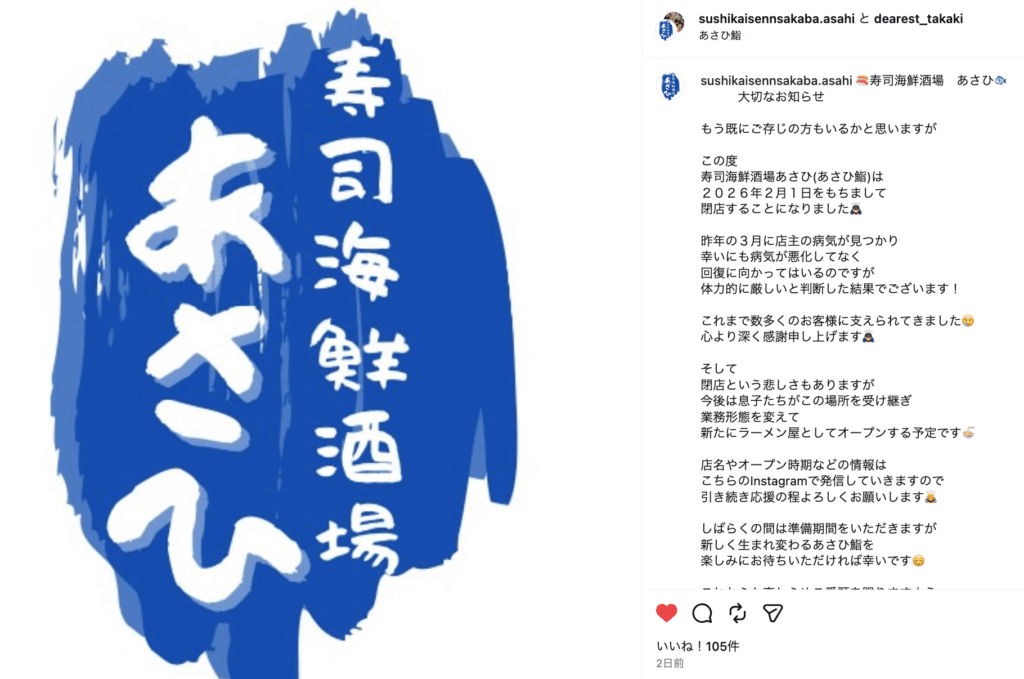 新店情報は、「寿司海鮮酒場 あさひ」のInstagramで発信していくそうなので、気になった方はチェックしてみてください📲