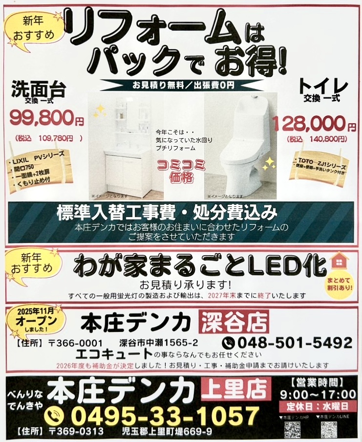 今回は昭和52年の創業以来、上里町を拠点に地域密着で住まいのお困りごとに向き合ってきた「本庄デンカ」のお得情報などを厳選してご紹介します✨