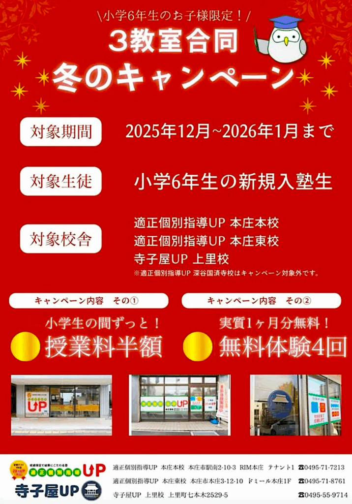 「適正個別指導UP」は定期テスト1科目20点UP保証! 『適正個別指導UP』は、本庄市内に2校(本庄本校・本庄東校)、深谷市内に1校(深谷国済寺校)、上里町に「寺子屋UP …