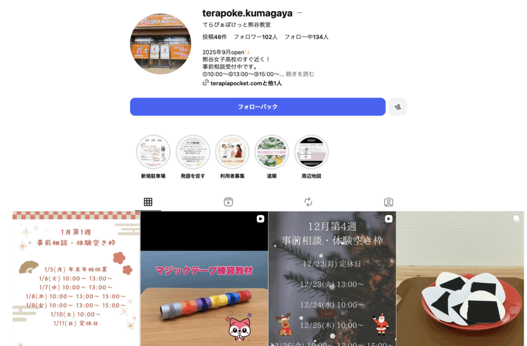 先生達(児童)の様子や療育への思い、教室の最新情報や空き情報の確認などは、「てらぴぁぽけっと熊谷教室」のInstagramやポータルサイト「LITALICO(りたりこ)発達ナビ」内のブログで随時発信しているので、是非チェックしてみてください📲