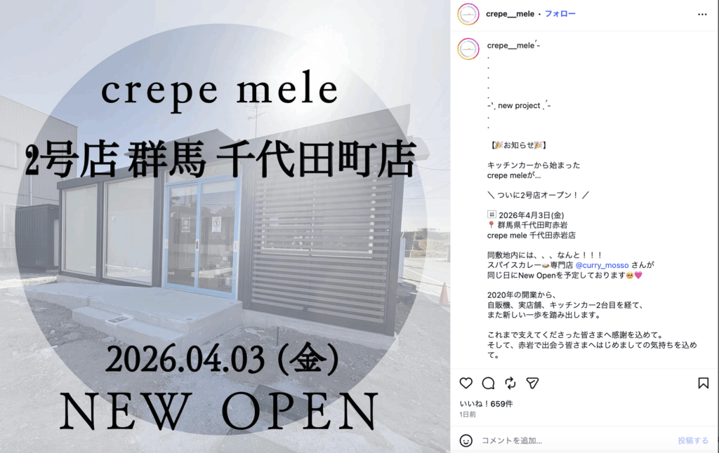 邑楽郡千代田町赤岩に「crepe mele 千代田赤岩店」がオープンするみたいです。