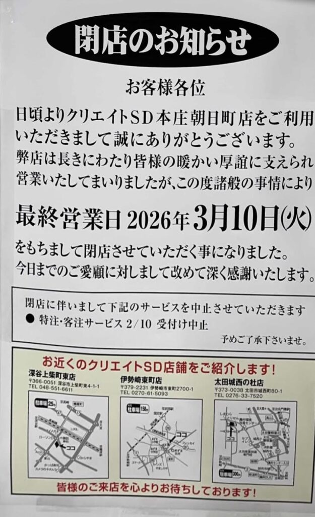 本庄市朝日町にあるドラッグストア「クリエイトSD本庄朝日店」が閉店するみたいです。