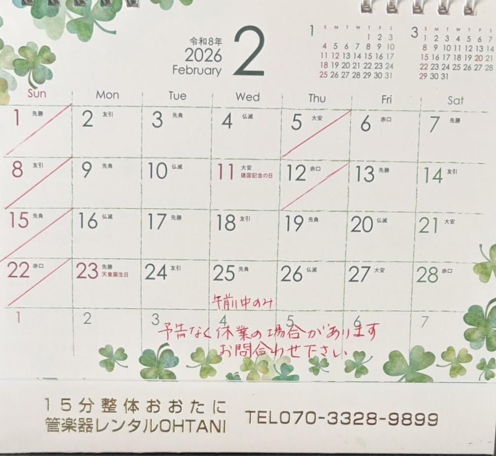 【2026年2月のお休み】