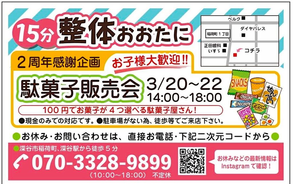そんな「15分整体おおたに」がオープン2周年の感謝を込めて、期間限定の「駄菓子販売会」を開催します😸
