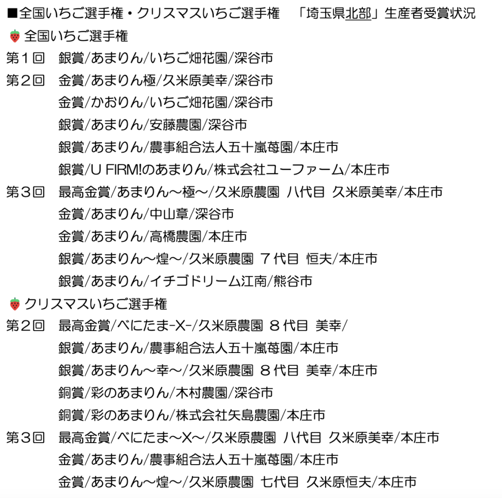 埼玉県のいちごは、(一社)日本野菜ソムリエ協会主催の「第3回 全国いちご選手権(2025年2月5日開催)」において、全国から375品のエントリー中「あまりん」の最高金賞をはじめ銅賞以上16品のうち8品(金賞3品、銀賞3品、銅賞1品)が賞を獲得しました🥇
