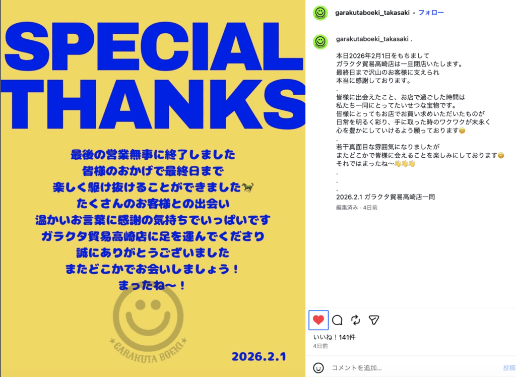 2026年2月1日(日)をもって現店舗での営業を一旦終了したそうです。
