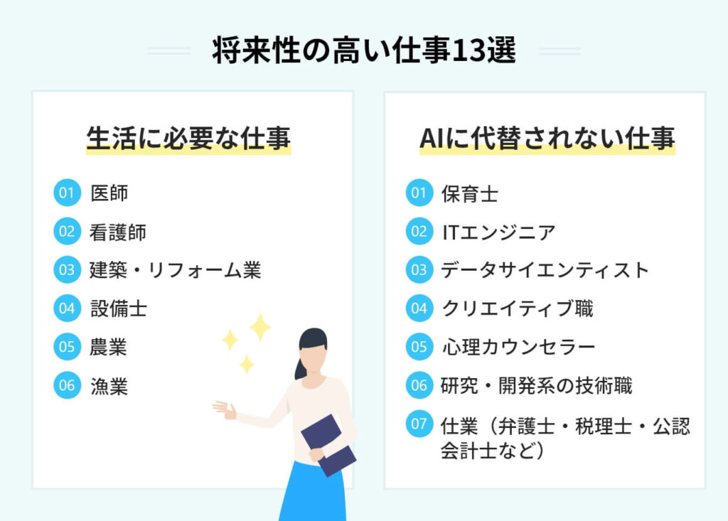 一方で、AIが普及しても、保育士や介護士、医師・看護師、カウンセラー、ITエンジニア、コンサルタントなどは、人間にしかできないホスピタリティや高度な判断が必要なため、依然として重要視されると予測されています。