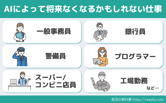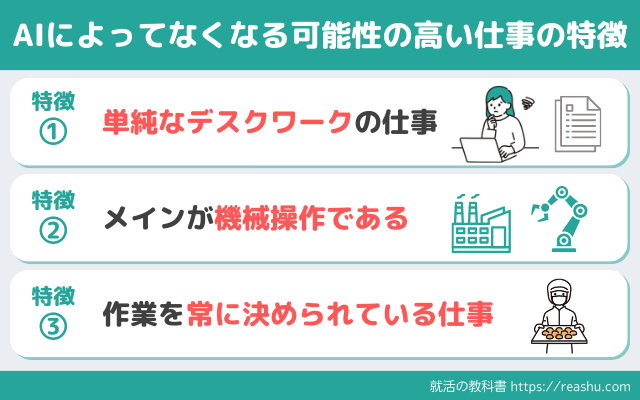 20年後になくなる、あるいはAIやロボットに代替される可能性が高い仕事には、単純な繰り返し作業やデータの処理、予測可能な環境での業務が共通して挙げられています。