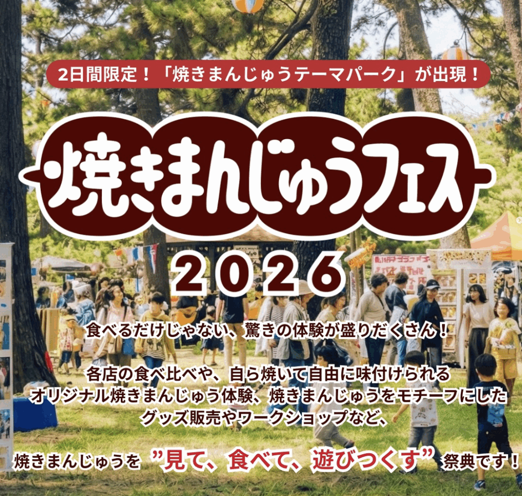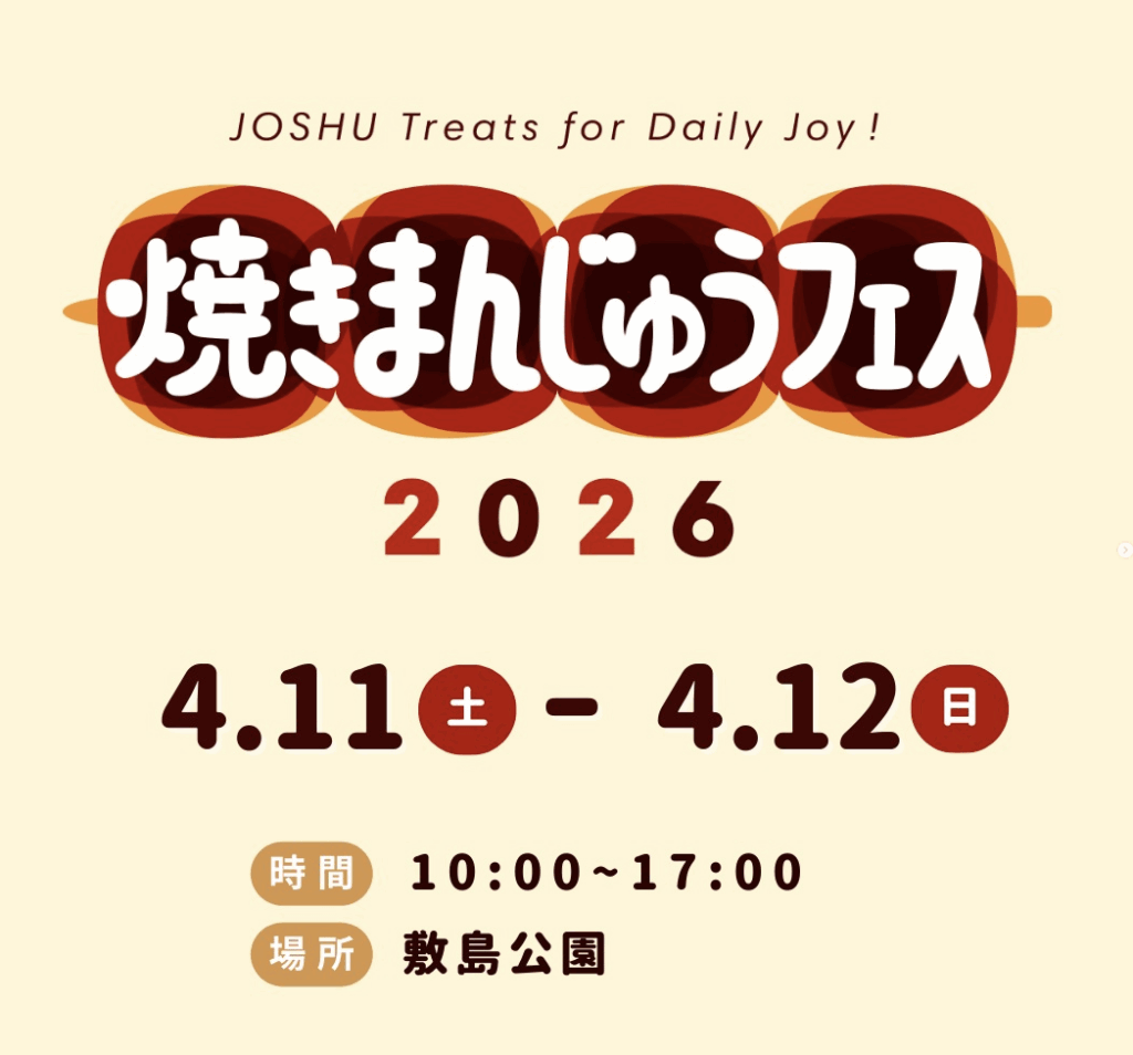 群馬県前橋市敷島町にある「敷島公園」で『焼きまんじゅうフェス 2026』が開催されるみたいです。