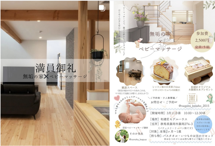 ▲また、「和建匠」の新モデルハウスで3月11日(水)に開催される「ベビーマッサージ」は、告知後すぐに定員に達してしまい、開催前から「次回はいつありますか?」というお問い合わせを多数いただいているそうです🙇