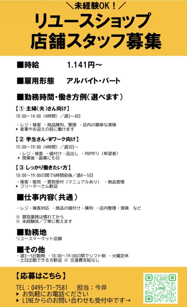 リユースマーケット」では、現在一緒に働いてくれるスタッフを募集しています😸