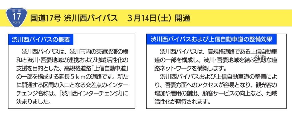 これにより国道17号中村交差点からの渋川西バイパス(延長約5km)と上信自動車道の金井ICを経由して箱島ICまで(延長約7km)の延長約12kmがバイパスとしてつながり、上信自動車道の金井IC(箱島IC方面)と国道17号が直結され、渋川市街地の混雑緩和と物流円滑化が期待されるそうです。