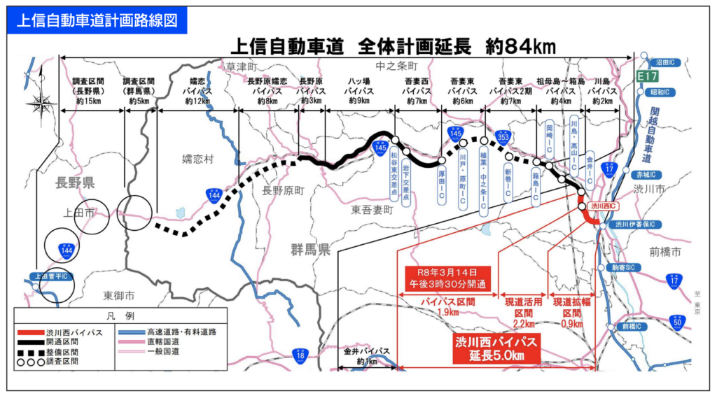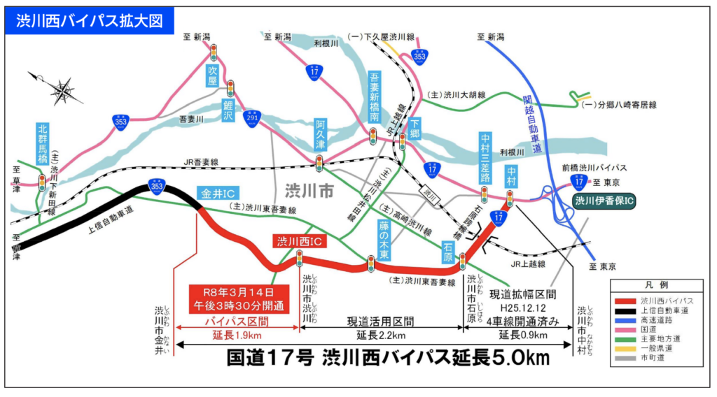 渋川市渋川~金井の1.9kmが開通し、既設区間と合わせて約5kmが全通しました。