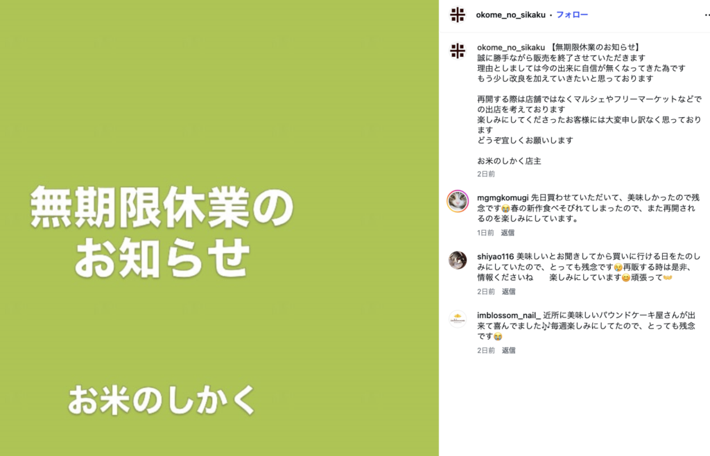 店舗での営業は休業をするそうですが、マルシェやフリーマーケットなどへの出店という形で再開することも検討しているようです。