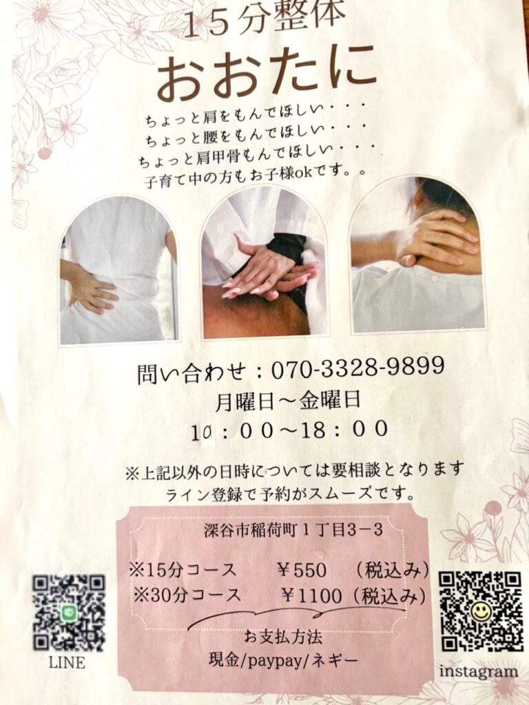 ★テナント料と人件費が発生しない(大谷さんがお一人&ご自宅で施術を行うため)ので、15分550円・30分1,100円という低価格で施術が可能😸