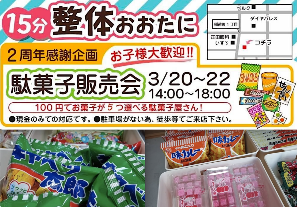 そんな忙しい埼北エリア在住の皆さんに大人気の「15分整体おおたに(管楽器レンタルOHTANI)」が、オープン2周年の感謝を込めて3日間限定で「駄菓子販売会」を開催します😸