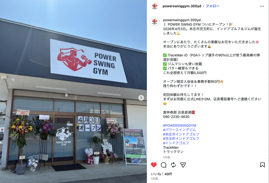 本庄市児玉町児玉南に無人営業のインドアゴルフ&ジム「POWER SWING GYM(パワースイングジム)」がオープンしたみたいです。