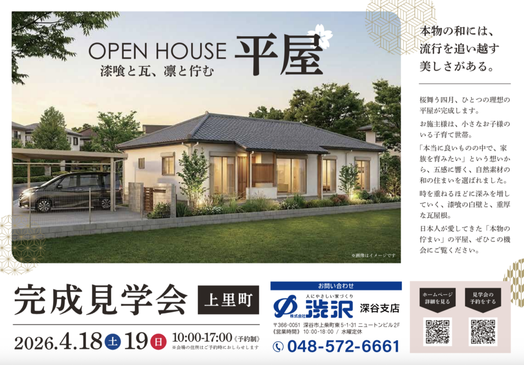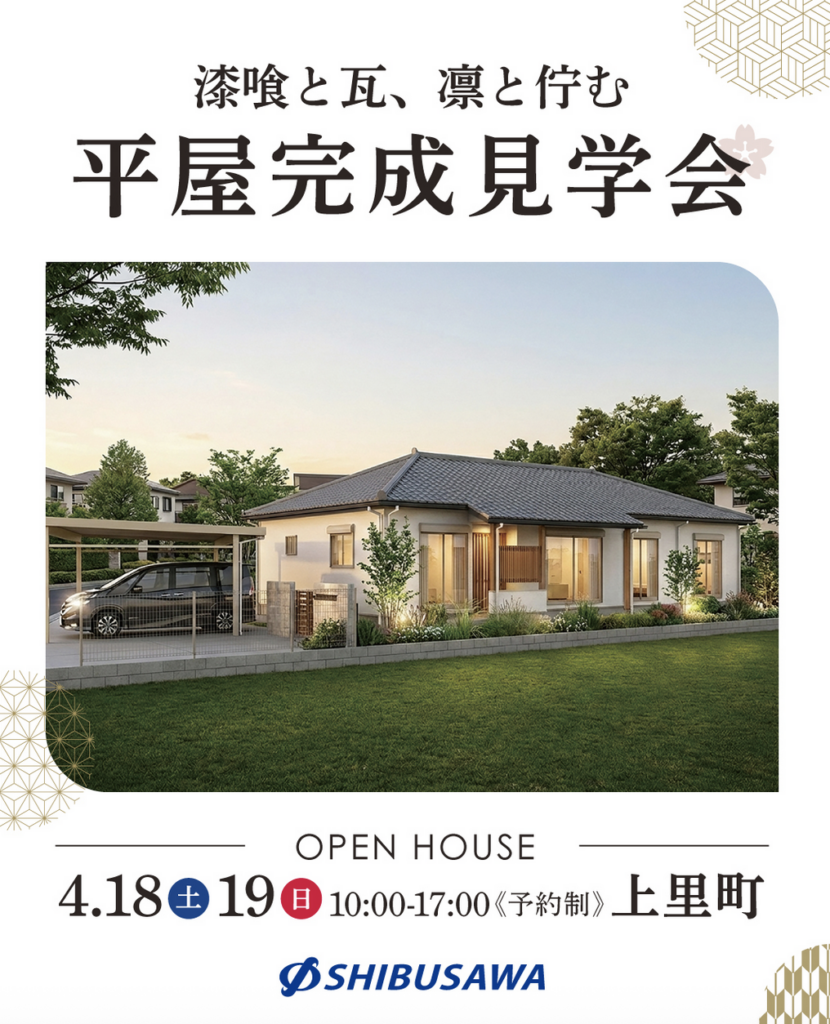 2026年4月18日(土)と19日(日)の2日間限定で『漆喰と瓦、凛と佇む平屋』の完成見学会』を開催いたします!