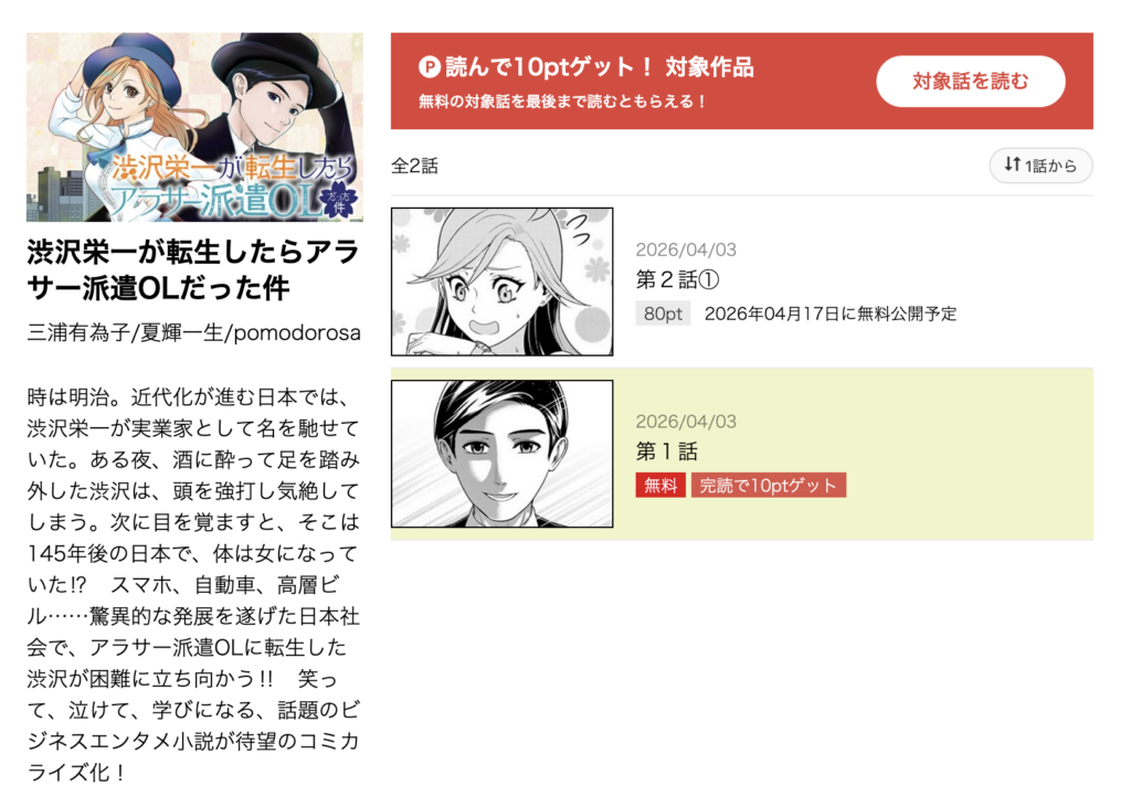 2024年に出版されたビジネスエンタメ小説「渋沢栄一が転生したらアラサー派遣OLだった件」が漫画化されたみたいです。