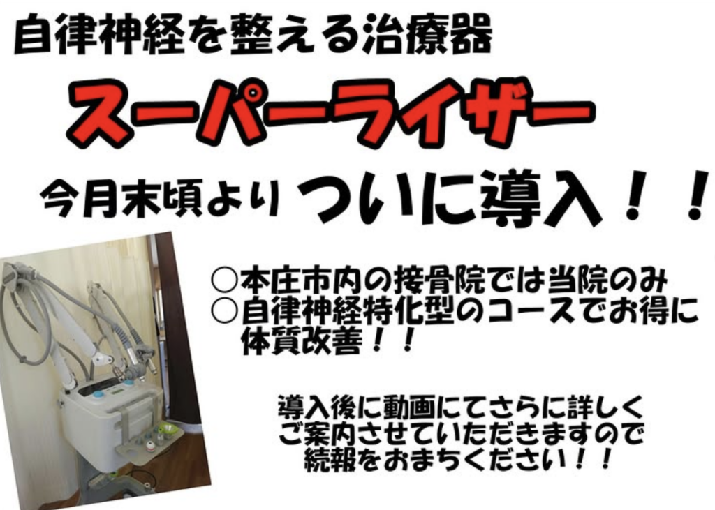 開院3周年を迎えた本庄市中央にある「あらい鍼灸接骨院」が、2025年から試験的に導入していた治療器「スーパーライザー」を、2026年4月末頃に正式に導入することになりました✨