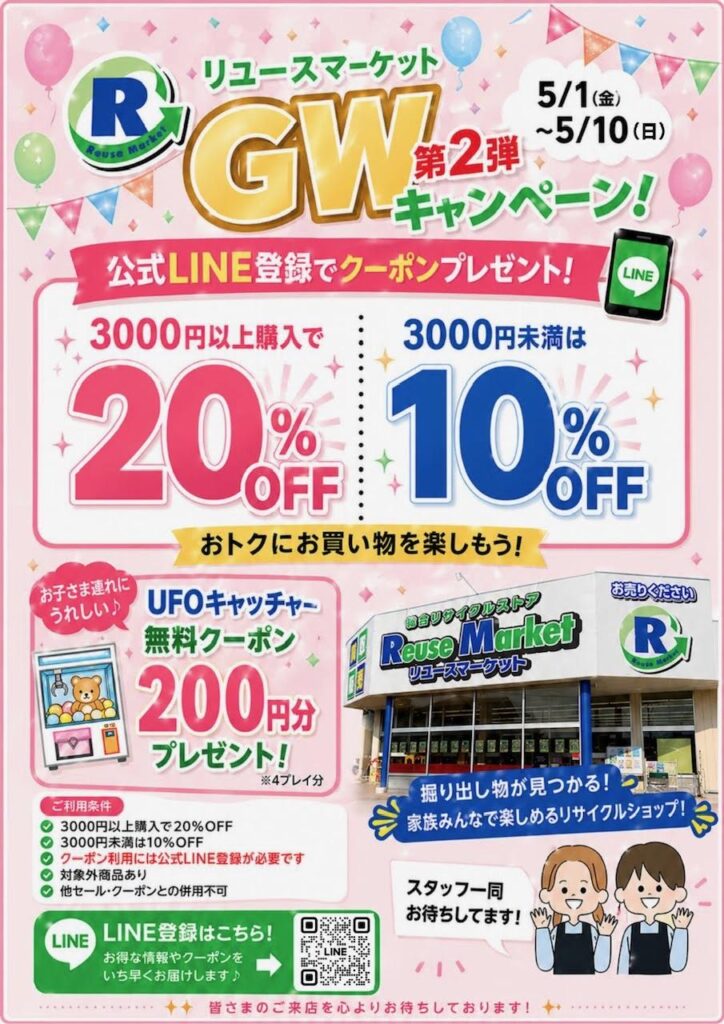 本庄市児玉町にある総合リサイクルストア「リユースマーケット」が、超お得な「GWキャンペーン2026」を開催中です😸