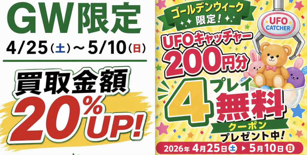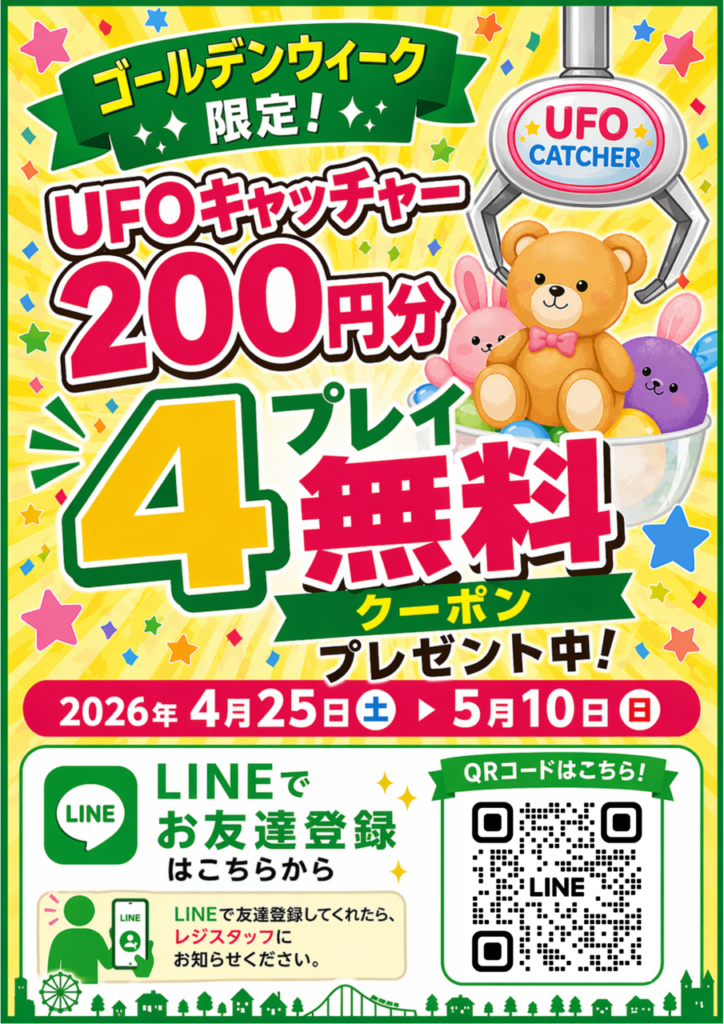 GW限定企画として、「リユースマーケット」に設置されたUFOキャッチャーが無料(200円分※4回分)になるお得な「UFOキャッチャー4プレイクーポン」を2026年5月10日(日)まで配布中です!
