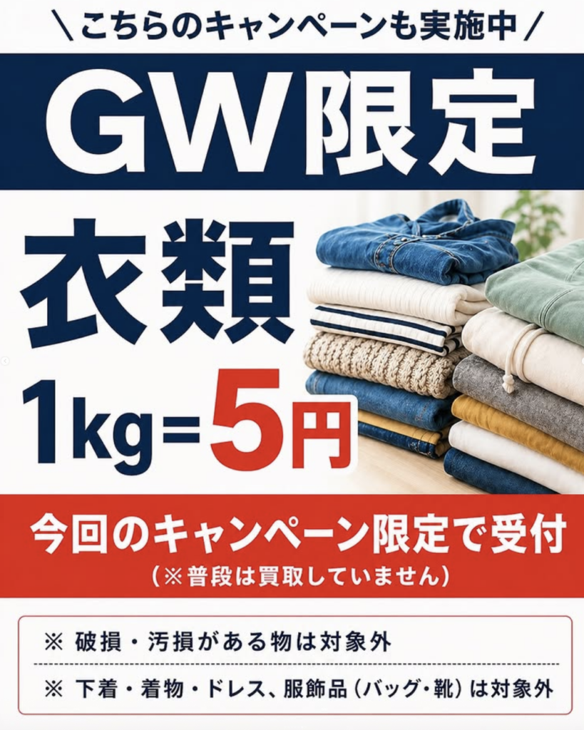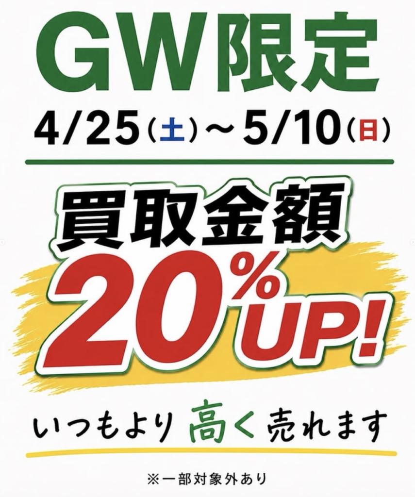 「リユースマーケット」では、2026年4月25日(土)〜5月10日(日)まで「GW買取キャンペーン2026」を開催中です🌸