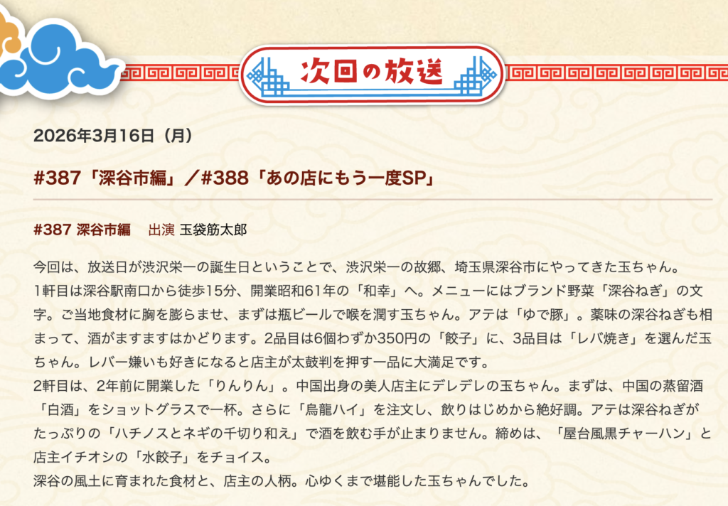 2026年3月16日(月)BS-TBSで放送する「町中華で飲もうぜ」で深谷市が映るみたいです。