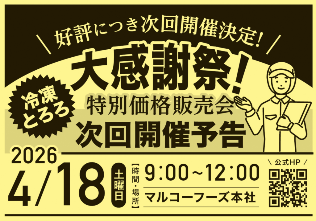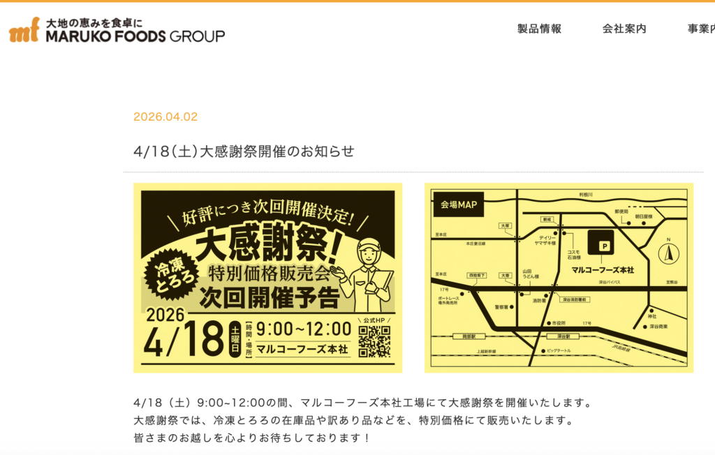 冷凍とろろ国内シェアNo.1企業「マルコーフーズ株式会社」本社(深谷市新戒)で、日頃の感謝を込めた大型イベント「マルコーフーズ 春の大感謝祭」が開催されます🎊