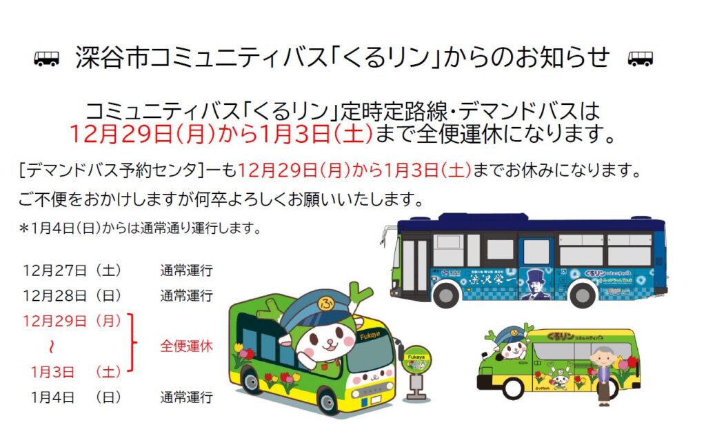 年末年始は深谷市コミュニティバス「くるリン」が全便運休するみたい。