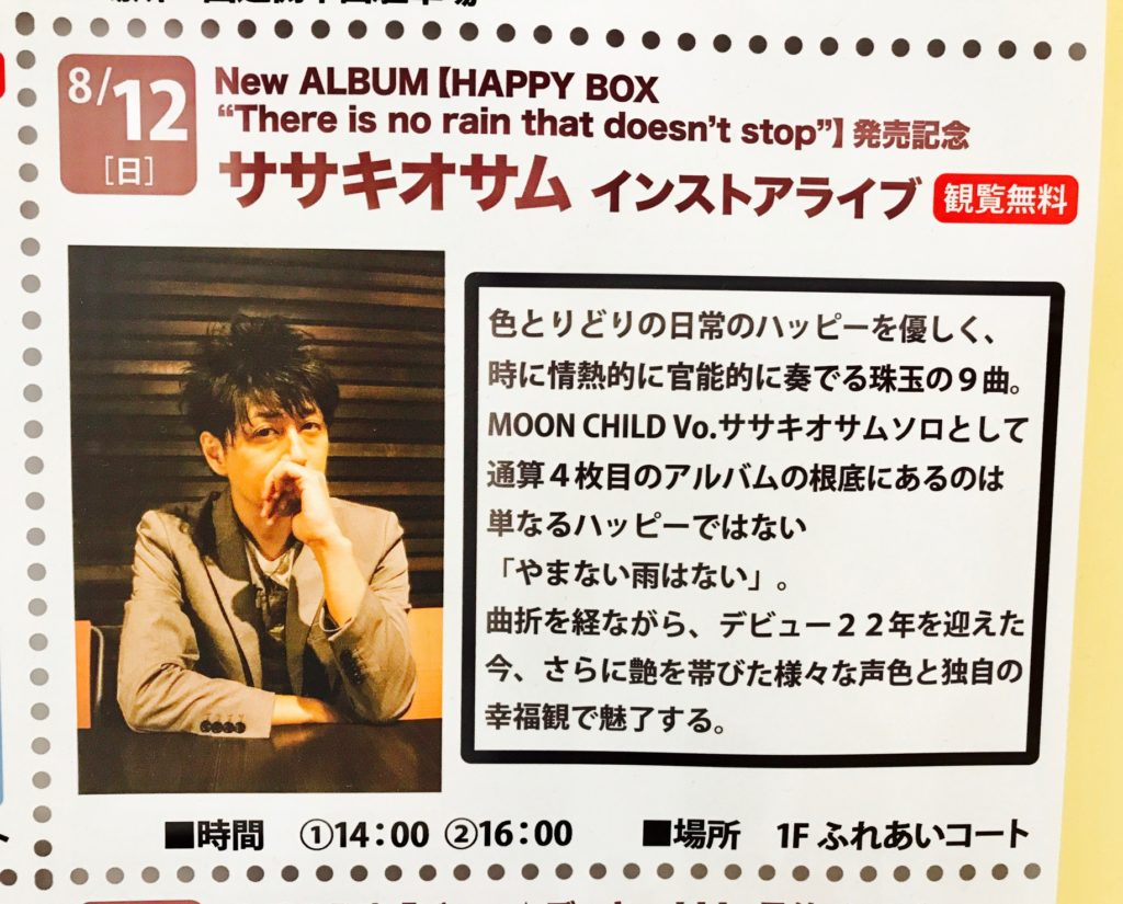 イオンタウン上里に「MOON CHILD」の元ボーカル「ササキオサム」が来るみたい。【イベント情報】