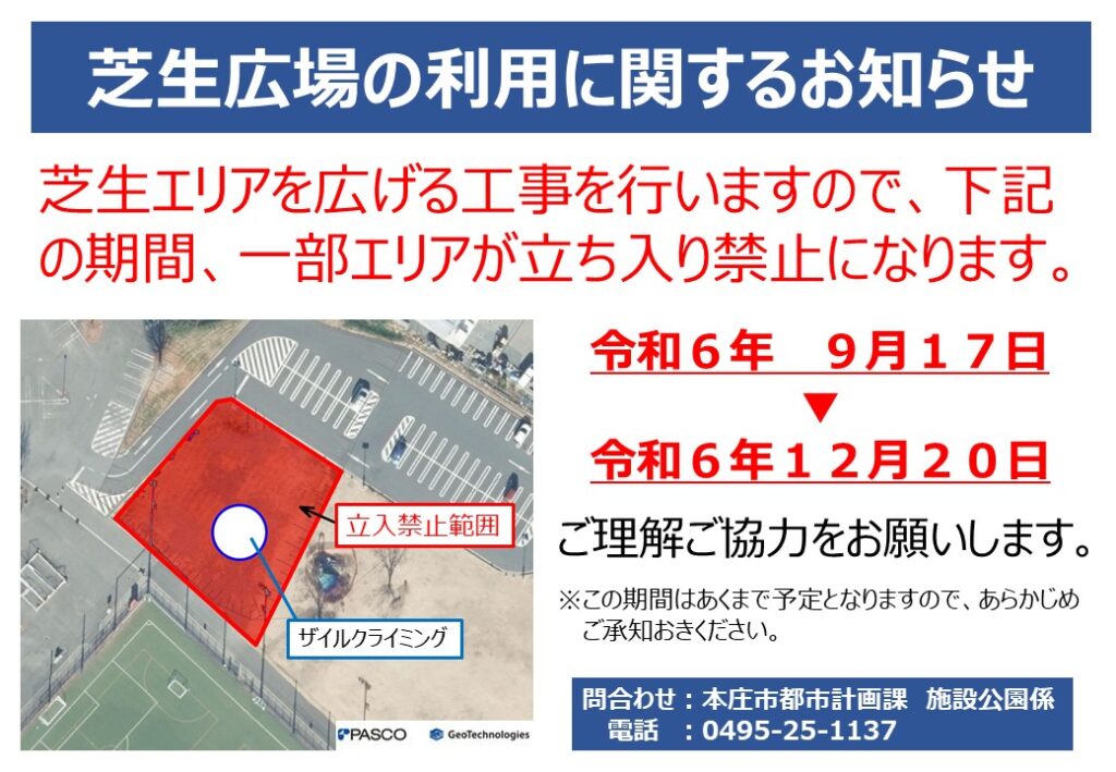 本庄市にある「若泉運動公園」の芝生広場一部が芝生拡張工事のためしばらく利用できないみたい。12月には新遊具設置予定。