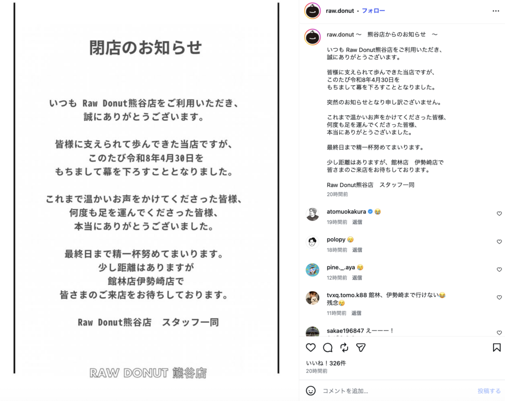 熊谷市箱田にあるテイクアウト生ドーナツ専門店「Raw Donut熊谷店」が閉店するみたいです。