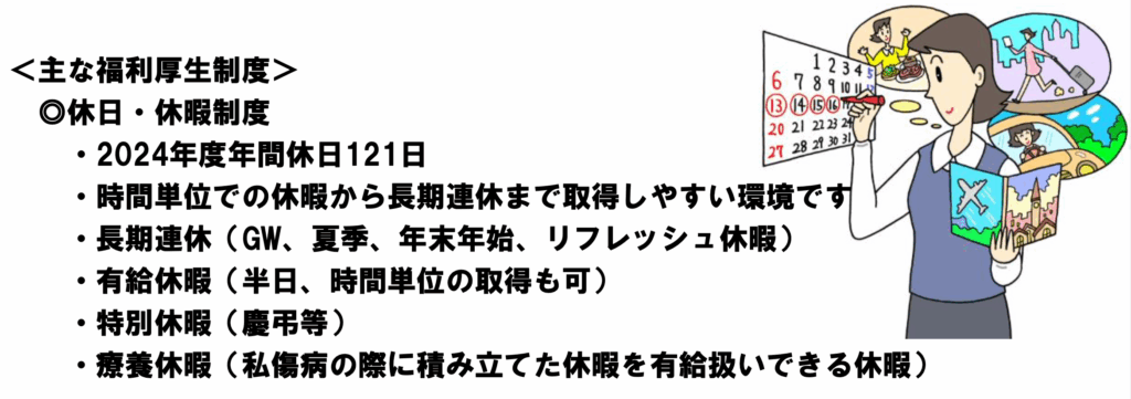 有給休暇(6ヶ月経過後の年次有給休暇日数10日※2年度目より20日付与)、半日有給休暇、特別休暇、療養休暇(最大60日まで積立可)