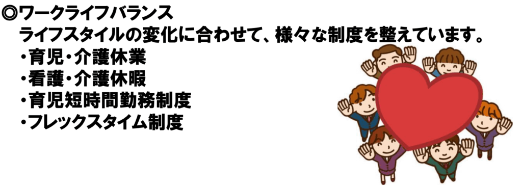 完全週休2日制のほか夏季休暇、年末年始休暇など長期連休を設定、有給休暇については、取得を促進する一斉取得制度の設定、ちょっとした用事を済ます半日有給休暇制度など休暇制度が充実しており、ワークライフバランスの環境が整っています。