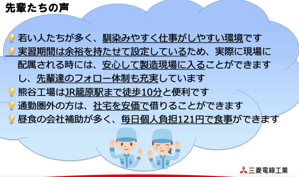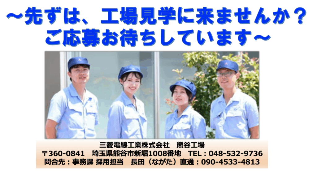 熊谷市新堀にある「三菱電線工業(みつびしでんせんこうぎょう)熊谷工場」では、2026年に予定している新工場(シール部品やゴム成形品の製造)完成に伴い、正社員を募集中です😸