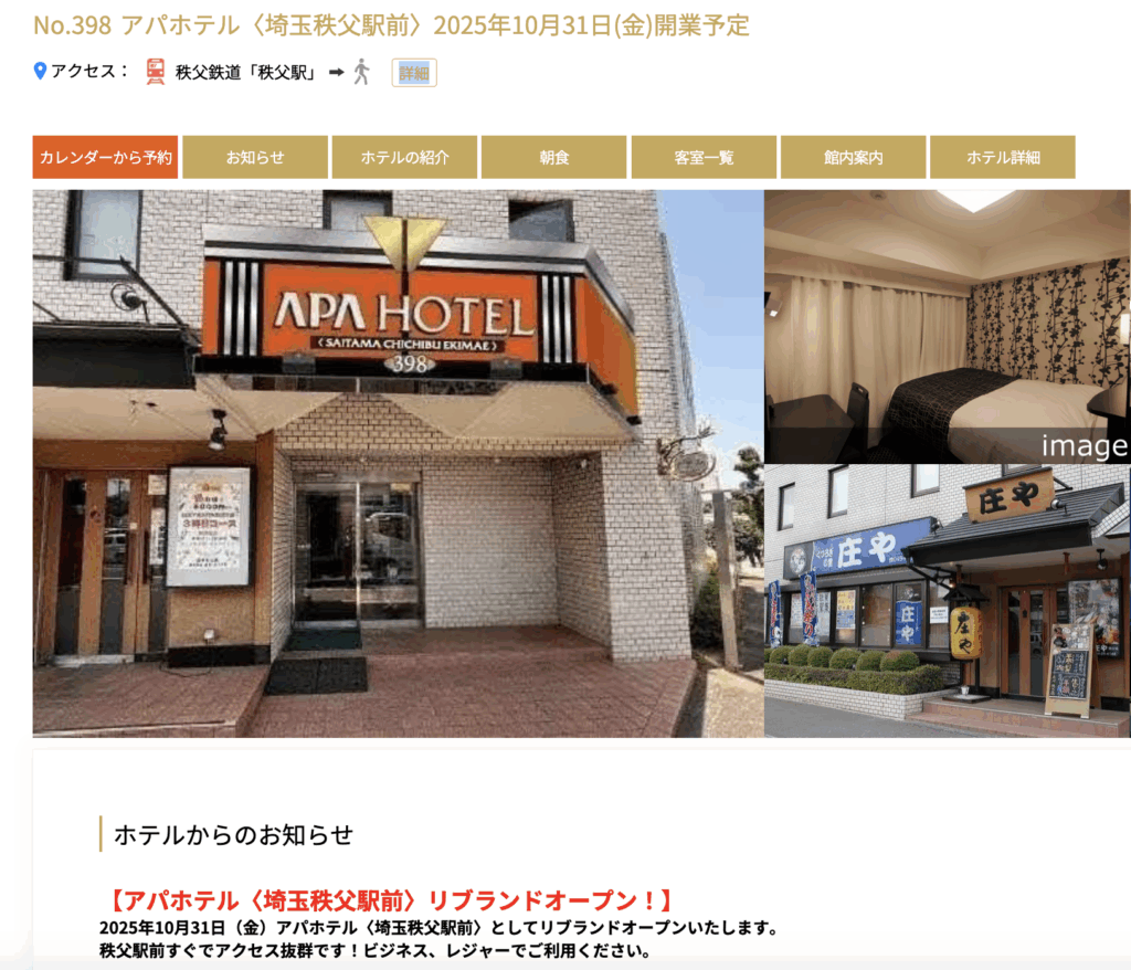 「第一ホテル秩父」がフランチャイズ契約を締結し、2025年10月31日(金)に「アパホテル埼玉秩父駅前」としてリブランドオープンするそうです。