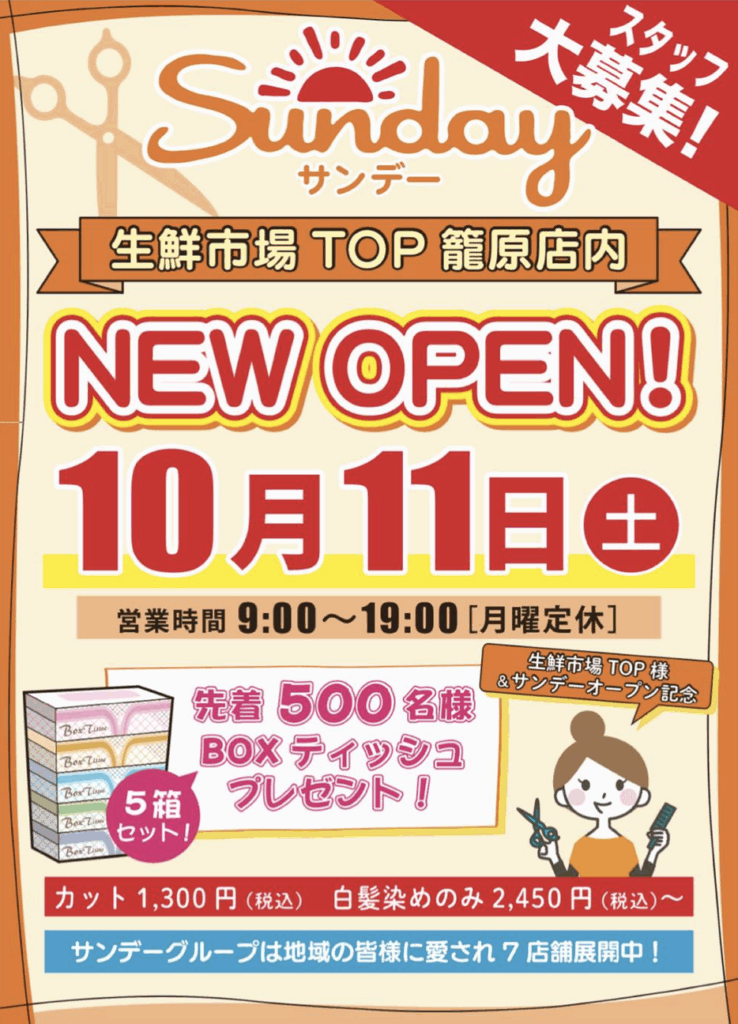 また、同日に美容室「Sanday生鮮市場TOP籠原店」もオープンしたそうです↓