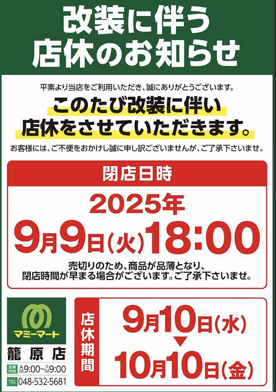 2025年9月9日に一旦営業を終了し、10月10日(金)までリニューアル準備のため店休していました↓