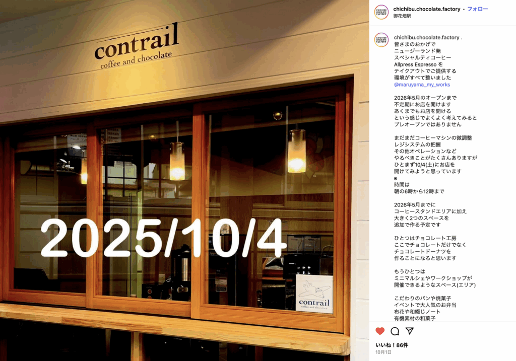 秩父市東町に「Contrail Coffee & Chocolate」というコーヒーとチョコレートのお店がプレオープンしたみたいです。