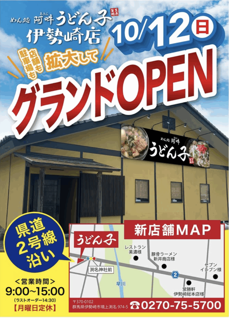 伊勢崎市間野谷にあった「めん処阿吽うどん子 伊勢崎店」が移転&リニューアルオープンしたみたい。