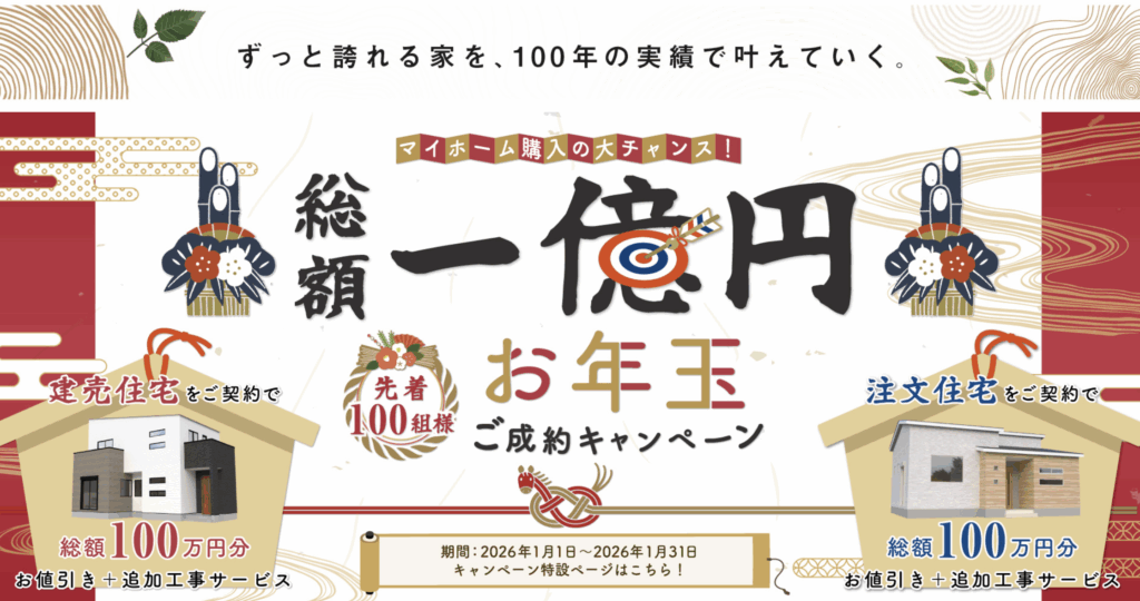 2026年1月1日(木・祝)〜31日(土)までに 「横尾材木店」の建売住宅または注文住宅のご成約で1邸につき100万円分還元(物件価格から50万円お値引き+オプション50万円分サービス)する「総額1億円!2026年お年玉キャンペーン」を開催していま!